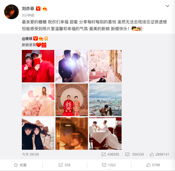 - Lưu Diệc Phi: “Đường Đường yêu dấu! Chúc cả hai ngọt ngào hạnh phúc, cùng nhau chia sẻ mọi sự buồn vui trong cuộc đời. Mặc dù không có cách nào đi tham dự thấy rất hối tiếc nhưng vẫn có thể cảm nhận được không khí hạnh phúc, ấm áp từ trong mỗi bức hình. Cô dâu xinh đẹp nhất, chúc bạn đại hôn vui vẻ”.