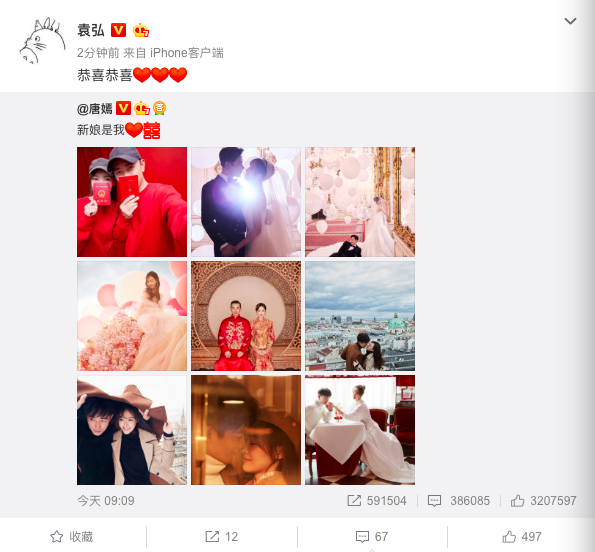 La Tấn và Đường Yên sau nhiều tin rumor cuối cùng cũng đã chính thức bước vào lễ đường thành hôn vào ngày hôm qua 28/10 ở Viên trong một khung cảnh vô cùng lộng lẫy xinh đẹp. Vào lúc 9 giờ 9 phút ngày 28 tháng 10 cả hai đã đăng lên những hình ảnh áo cưới và giấy lĩnh chứng tuyên bố chính thức kết hôn với bài viết: “Cô dâu là tôi” “Chú rể là tôi” thu hút lượng lớn người quan tâm. Bên cạnh lời chúc phúc của cư dân mạng là những vạn bè, huynh đệ tỷ muội tốt của cả hai như Trương Tịnh Dĩnh, Lưu Diệc Phi, Dương Mịch, Hồ Ca, Diêu Thần, Tiêm Nhẫn Tư… mỗi người theo một phong cách riêng của mình cũng đã gởi lên những lời chúc phúc cho cặp đôi ngay sau đó.