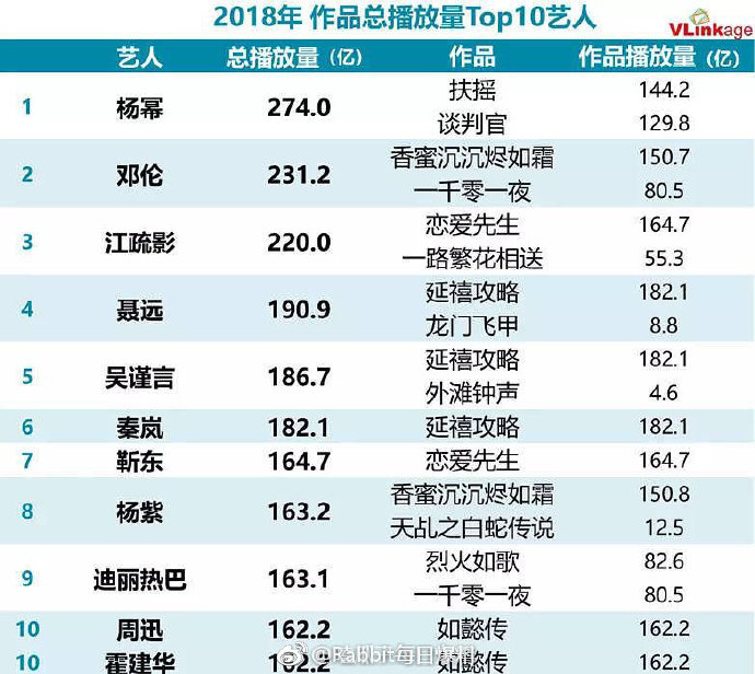 Nối gót theo họ là Dương Tử với tổng hơn 16 tỷ nhờ vào phim Hương mật tựa khói sương và Thiên kê chi bạch xà truyền thuyết đứng ở vị trí thứ 7. Địch Lệ Nhiệt Ba với Liệt hỏa như ca và Nghìn lẻ một đêm đứng vị trí thứ 7 với tổng lượng phát sóng là hơn 16 tỷ thua Dương Tử 10 triệu lượt.