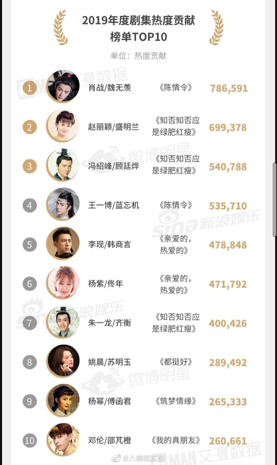 Ngoài ra, vị trí top 5 còn lại gồm một số minh tinh với các vai diễn như Dương Tử với vai diễn Đồng Niên trong Thân ái nhiệt tình yêu thương. Đây cũng là tác phẩm liên tiếp trong hai năm liền của Dương Tử trở nên vô cùng hot sau Hương mật tựa khói sương (2018).