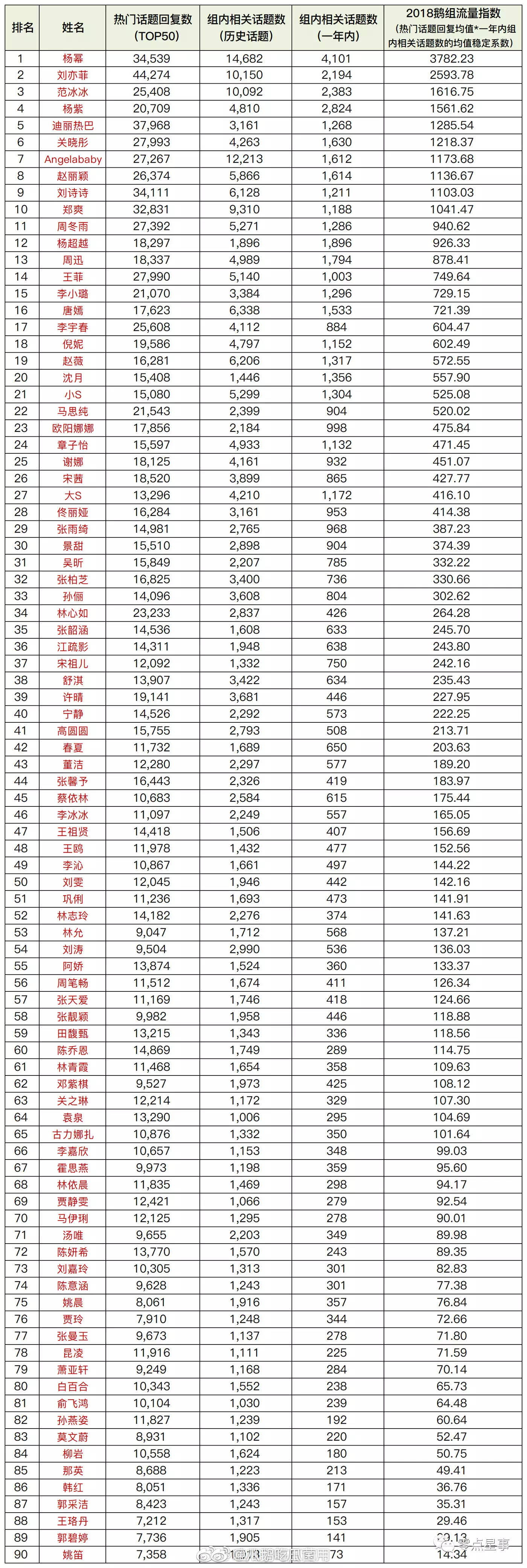 Dẫn đầu danh sách này là nữ diễn viên Dương Mịch - một trong những hoa đán nổi tiếng trong ngành giải trí Hoa ngữ hiện nay. Dương Mịch sinh năm 1986 và được mọi người chú ý nhờ vào vai diễn Quách Tương trong bảng Tân thần điêu đại hiệp năm 2006. Dương Mịch dẫn đầu danh sách này với chỉ số lưu lượng douban năm 2018 được tính theo công thức trên là 3783.23.