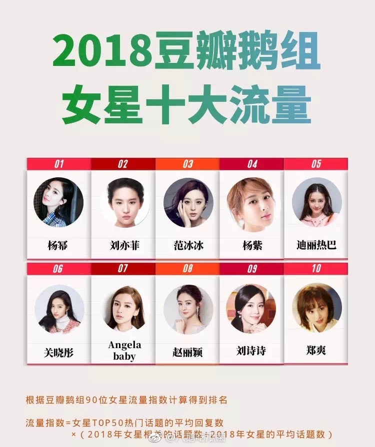 Lần lượt Quan Hiểu Đồng, Angelababy, Triệu Lệ Dĩnh, Lưu Thi Thi và Trịnh Sảng là năm cái tên tiếp theo góp mặt trong bảng xếp hạng mười nữ minh tinh lưu lượng lớn do douban công bố. Khi Quan Hiểu Đồng đứng vị trí thứ 6 với chỉ số lưu lượng là 1218.37. Angelababy đạt chỉ số 1173.68 đứng vị trí thứ 7.
