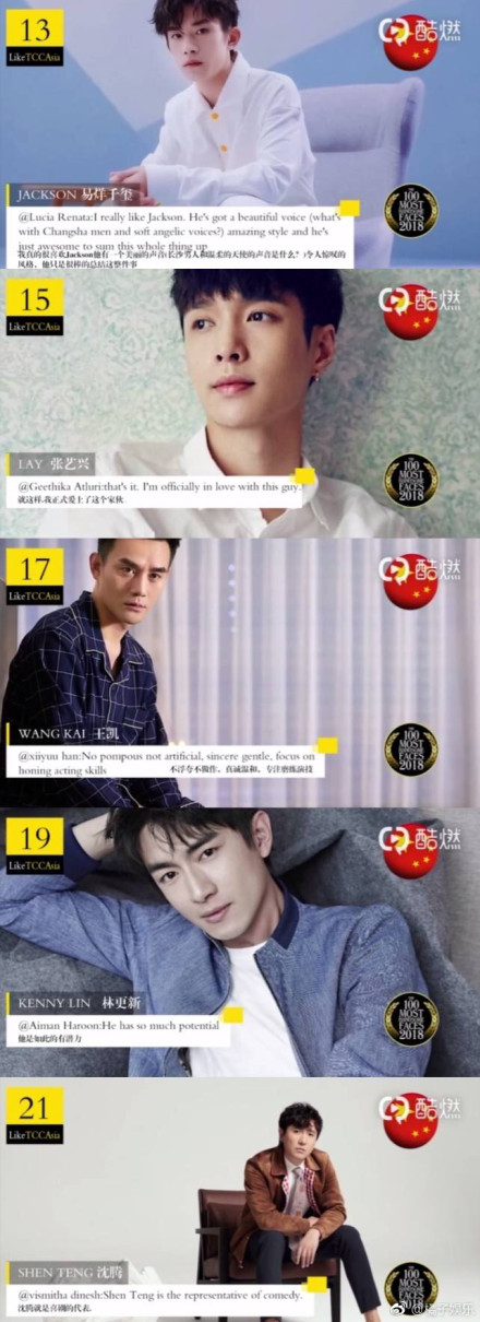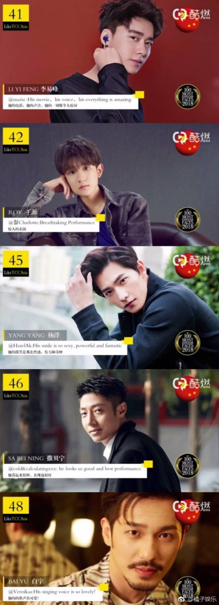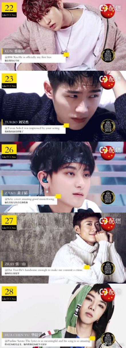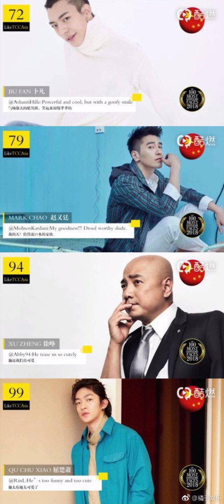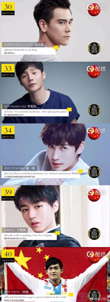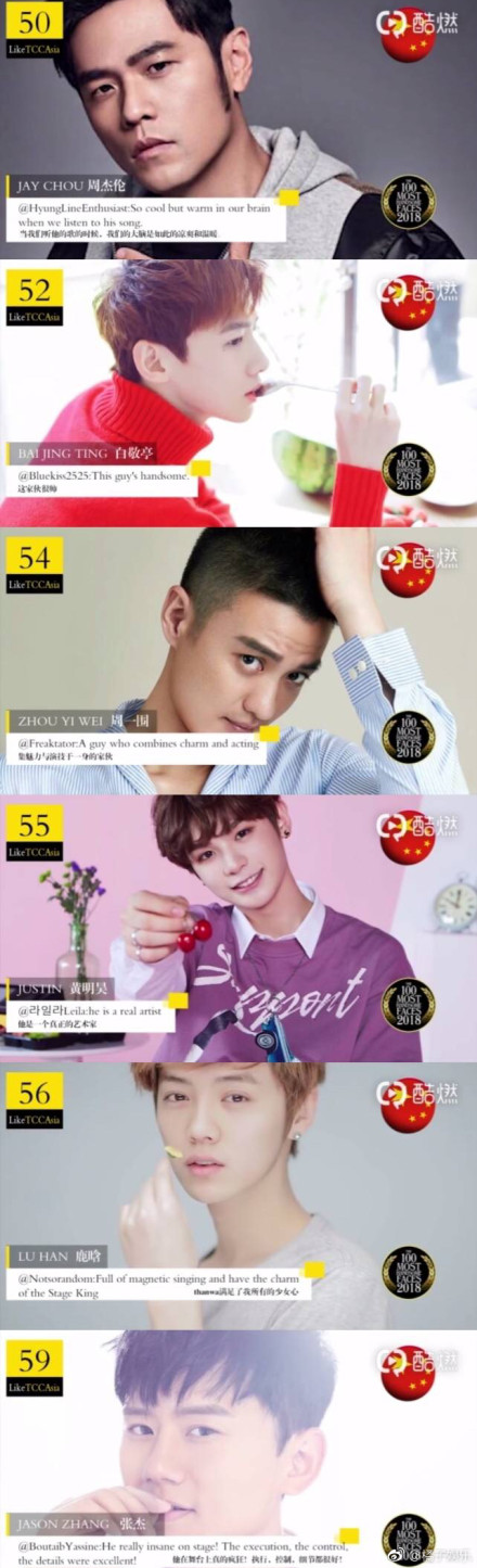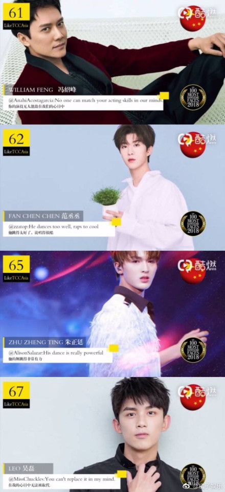 Trang mạng Mỹ TC Candler vừa mới công bố bảng xếp hạng 100 gương mặt đẹp trai nhất khu vực Châu Á Thái Bình Dương năm 2018. Trong đó Ngô Kinh, Hồ Ca hay Ngô Diệc Phàm… là những cái tên đến từ đất nước Trung Quốc, đặc biệt ngôi sao Chiến Lang 2 đã xuất sắc vượt qua nhiều soái ca khác đứng đầu bảng xếp hạng này, Hồ Ca xếp ở vị trí thứ 6 và Ngô Diệc Phàm xếp ở vị trí thứ 8.