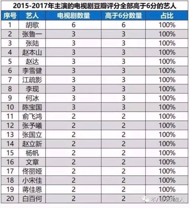 Douban là một trang mạng đánh giá phim ảnh và sách báo nổi tiếng hàng đầu Trung Quốc. Mới đây, trang này đã cho ra danh sách top 20 nghệ sỹ có điểm đánh giá trung bình của các bộ phim từng tham gia cao hơn 6/10 điểm kể từ năm 2015 đến 2017. Và dưới đây là danh sách top 20 nghệ sỹ xuất sắc
