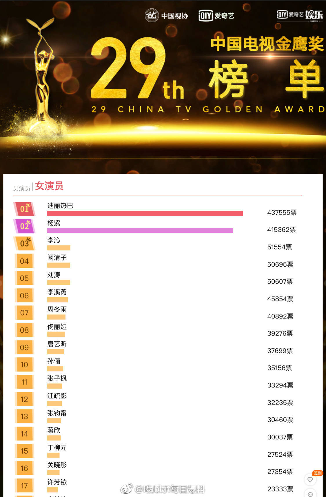 Trong khi đó về phía top 5 diễn viên nữ tạm thời trước mắt là do Địch Lệ Nhiệt Ba dẫn đầu, Dương Tử cũng đã thành công đuổi theo sau với vị trí thứ hai, trong khi đó Lý Thấm, Hám Thanh Tử, Lưu Đào lại bị đẩy xuống vị trí thứ 3, 4 và 5. Như vậy có thể thấy thực lực của Địch Lệ Nhiệt Ba và Dương Tử là không thể đùa được.