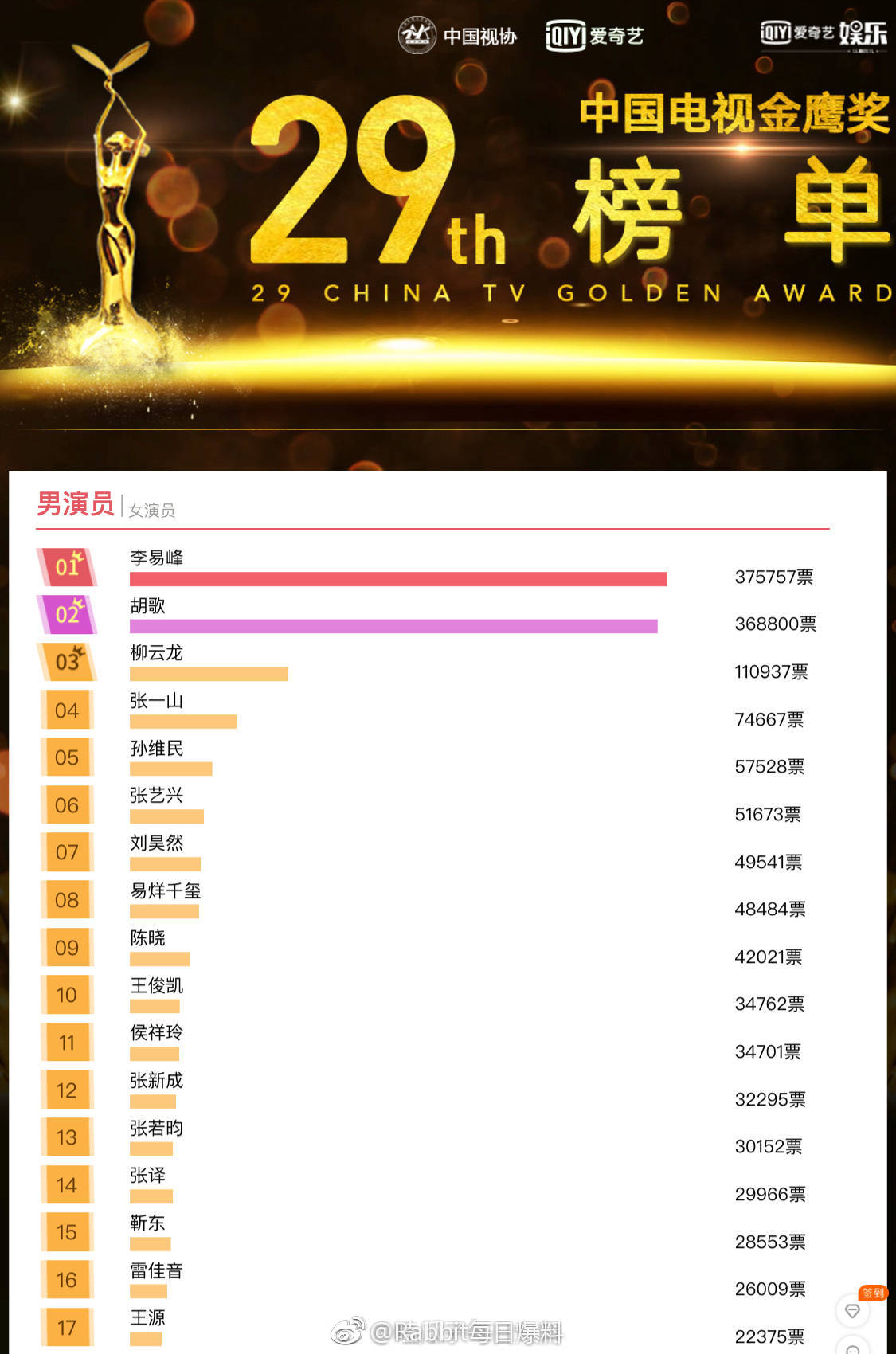 Có thể thấy Lý Dịch Phong và Hồ Ca đang là hai diễn viên có số phiếu dẫn đầu, trước mắt Hồ Ca tạm thời ở vị trí thứ hai còn vị trí thứ nhất thuộc về Lý Dịch Phong với hơn 300 ngàn phiếu. Đối với việc Lý Dịch Phong dẫn đầu cũng không có gì là lạ khi anh đã tính lũy không ít cho mình fan hâm mộ. Kể từ khi gia nhập ngành giải trí cho đến nay Lý Dịch Phong đã tích lũy cho mình không ít những vai diễn sáng giá như Bách Lý Đồ Tô/Hàn Vân Khê trong Cổ kiếm kỳ đàm, Ngô Tà trong Đạo mộ bút ký hay Trương Tiểu Phàm trong Tru tiên - Thanh vân chí. Hơn nữa, khả năng diễn xuất của Lý Dịch Phong càng ngày càng được nâng cao, bộ phim Thế giới động vật do anh đóng chính nhận được nhiều sự đánh giá tích cực, danh tiếng cũng không tệ.