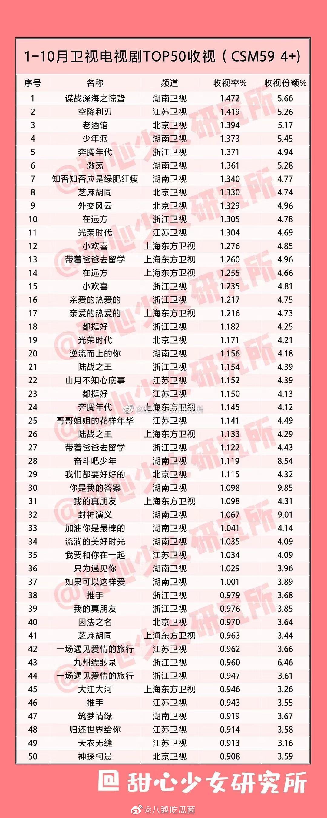 Đứng đầu danh sách là bộ phim Ma tước 2 - Kinh trập do Trương Nhược Quân và Vương Âu đóng chính với rating trung bình lên đến 1.472. Ma tước 2 lên sóng tập cuối cách đây không lâu, ngoài 2 ngày có rating dưới 1 còn lại những ngày khác rating của phim đều nằm trong khoảng từ 1 - 1.7, một con số ấn tượng không phải phim nào cũng đạt được. Tuy rating của Ma tước 2 không bằng Ma tước 1 do Lý Dịch Phong và Châu Đông Vũ đóng chính nhưng đây cũng là thành tích xuất sắc đối với một bộ phim không được tuyên truyền mạnh.