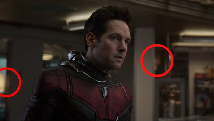 Như bạn có thể thấy ở trên, cảnh Scott Lang/Ant-Man lo lắng nhìn xung quanh được đặt bên trong sảnh của trụ sở Avengers- nơi chúng ta thấy nhiều nhân vật khác xuất hiện trong trailer. Nếu bạn nhìn kỹ vào hậu cảnh của Ant-Man (các khu vực được khoanh tròn), bạn sẽ nhận thấy một quả cầu lửa nổ khổng lồ từ từ lấp đầy các cửa sổ của tổng hành dinh vào phút 1:34.