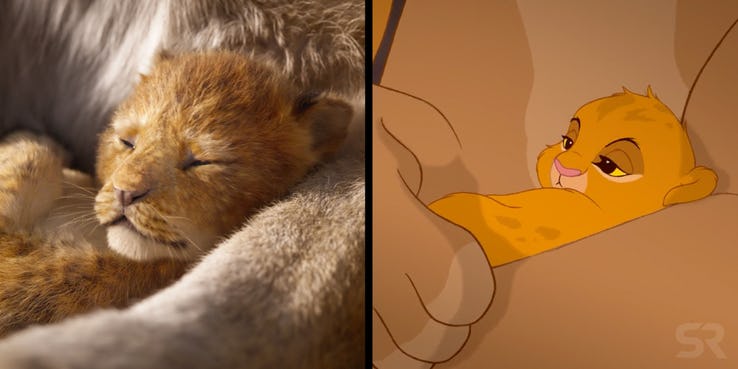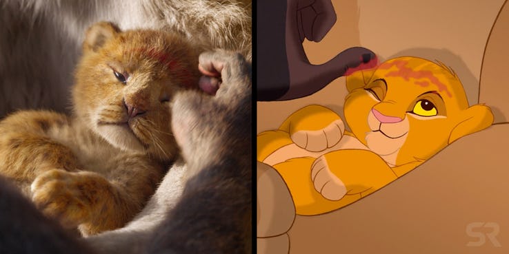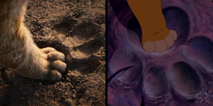 Khoảng khắc đầy ý nghĩa và mang tính biểu tượng cao chính là khi Simba ướm chân vào dấu chân của cha mình. Nếu để ý chúng ta sẽ thấy góc quay ở bản remake đã xoay lại so với bản hoạt hình, tạo cảm giác tự nhiên hơn.