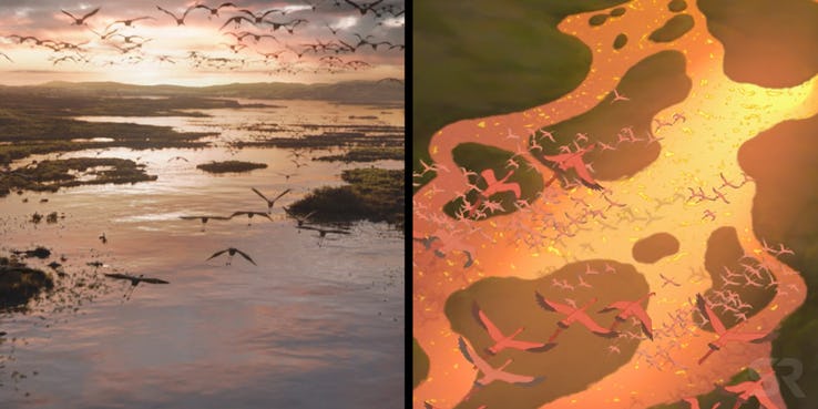 Hình ảnh này được phiên bản live-action thể hiện khá tốt và trọn vẹn hơn so với bản hoạt hình. Khung cảnh bên dưới đàn chim được “bày biện” đẹp đẽ và hùng vĩ hơn hẳn so với bản gốc, một số góc trong bản remake cũng được điều chỉnh mới lạ và đẹp mắt hơn.