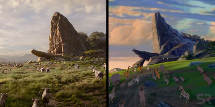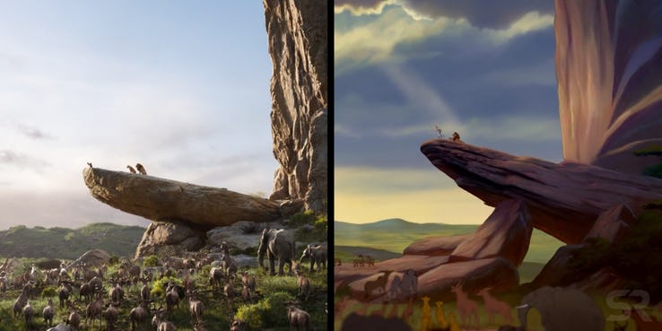 Pride Rock trong phiên bản remake được khắc họa rõ nét và chân thật hơn, những vân đá và vết cắt cũng được thể hiện rõ hơn so với phiên bản gốc.