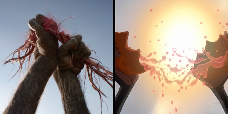Sự khác nhau rõ ràng ở hình ảnh này. Trong phiên bản hoạt hình thì Rafiki đang đập vỡ một loại trái cây còn ở phiên bản remake có vẻ là một loại cây nào đó và vẫn chưa hiểu dụng ý ở sự thay đổi này là gì.