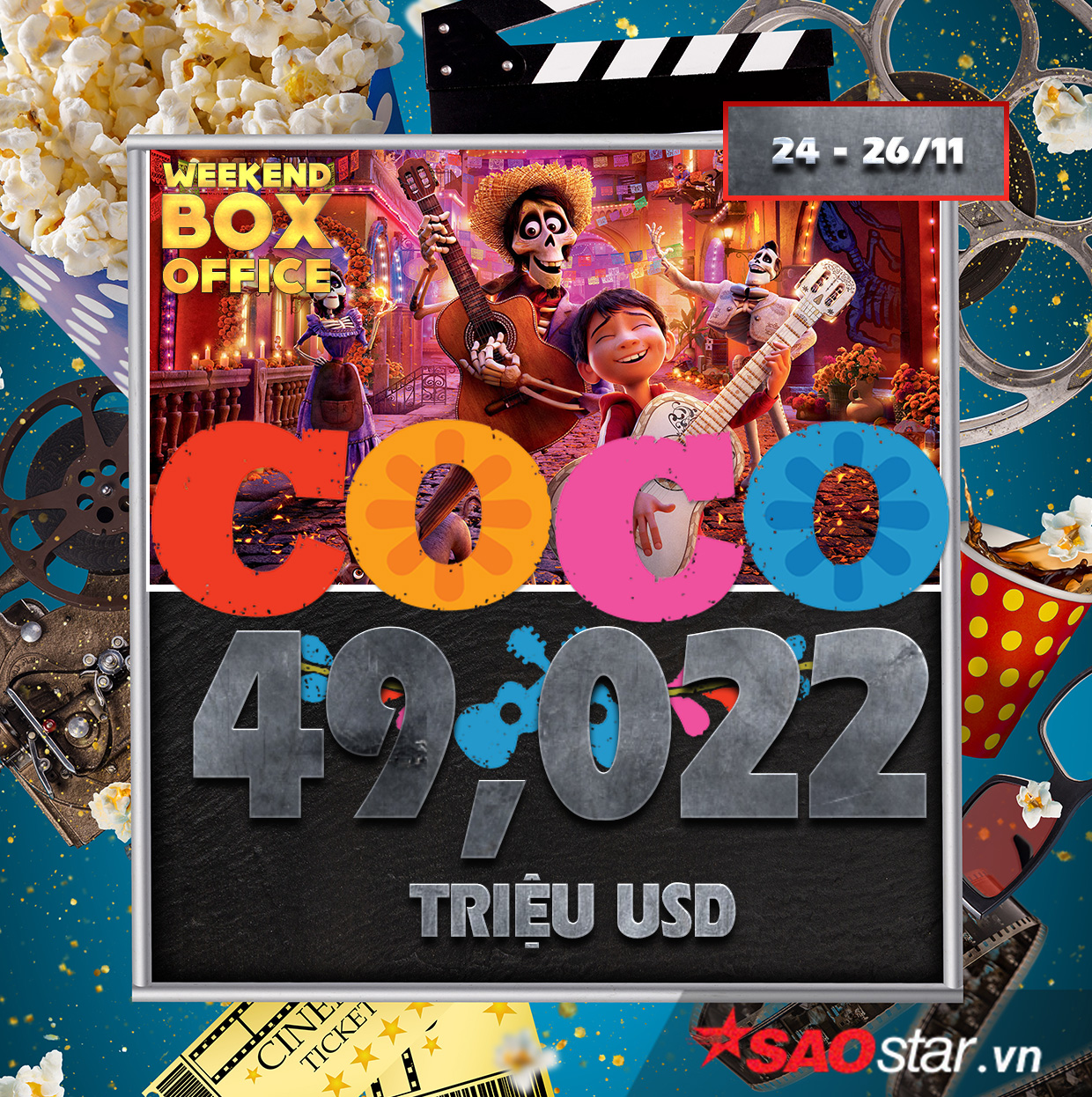 Với màn ra mắt mạnh mẽ vào 5 ngày vừa qua, bộ phim hoạt hình Coco của hãng Disney và Pixar đã ghi tên mình vào danh sách những phim thành công nhất năm 2017. Coco ra mắt dịp lễ Tạ ơn (Thanksgiving) của nước Mỹ và nhanh chóng vươn lên ngôi vị đầu bảng doanh thu phòng vé trong 3 ngày cuối tuần vừa qua. Với 49 triệu USD trong 3 ngày (24 - 26/11) và 71,2 triệu USD trong 5 ngày (22 - 26/11), bộ phim Coco đứng thứ 4 trong số các phim có doanh thu cao nhất dịp lễ Tạ ơn từ trước đến nay. Không chỉ thành công về mặt phòng vé, Coco cũng nhận được điểm số A+ từ CinemaScore, 80 điểm Metacritic và 96% từ Rotten Tomatoes. 53% khán giả đến rạp xem bộ phim này là nữ giới, ngoài ra 55% người xem từ 25 tuổi trở xuống.