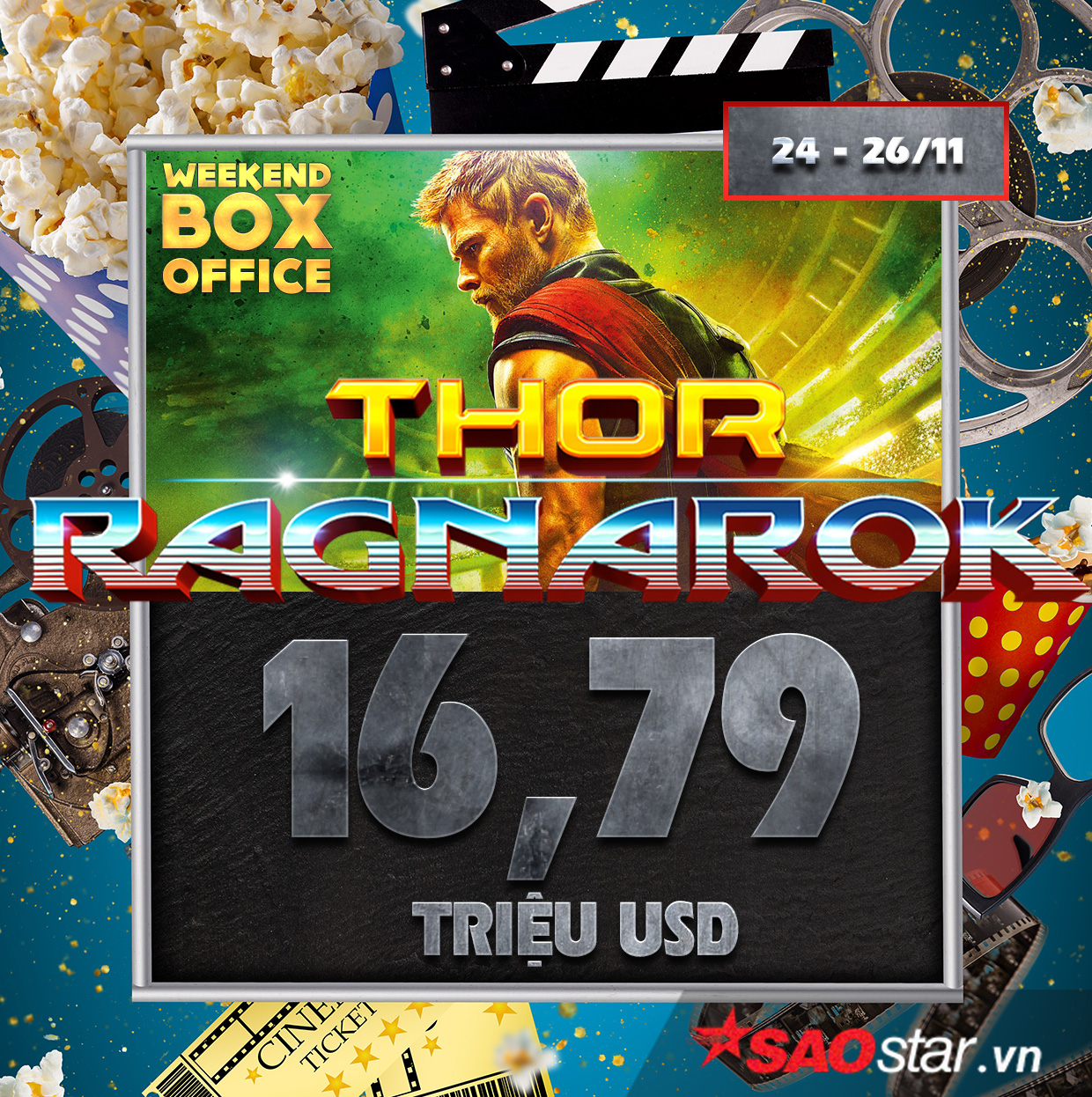 Thor: Ragnarok của Marvel và Disney xếp vị trí thứ 4 với 16,8 triệu USD. Hiện tại phần 3 của Thor đang là bộ phim của Vũ trụ điện ảnh Marvel. Ngoài ra, thị trường quốc tế cũng đã thu thêm 11 triệu USD, nâng tổng doanh thu toàn cầu lên 790 triệu USD.