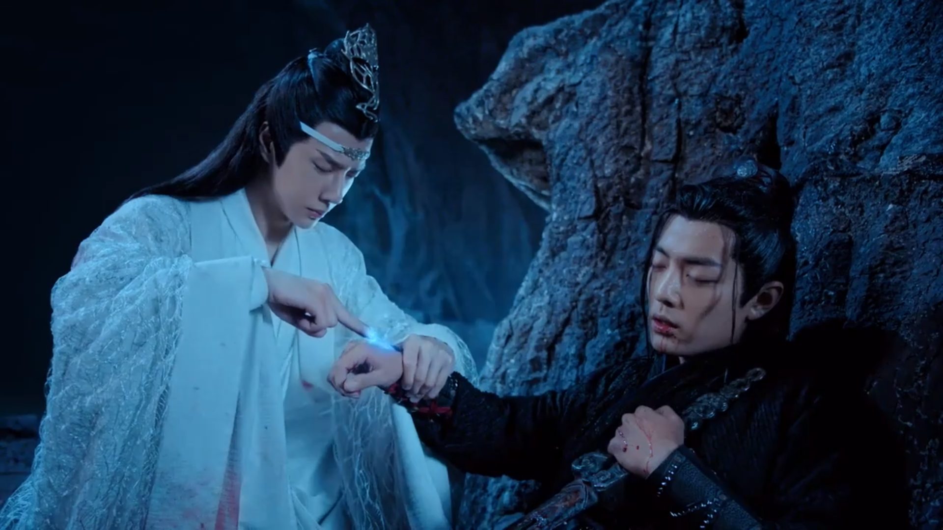 Sự cố xảy ra, Lam Vong Cơ vì cứu Ngụy Vô Tiện mà bị mắc kẹt ở lại, không thể thoát ra cùng mọi người, đồng thời vết thương trên chân phải càng trở nên trầm trọng. Ngụy Vô Tiện kiếm cành cây cố định chân cho Lam Vong Cơ, tiện thể lấy luôn mạt ngạch trên trán y để băng bó.