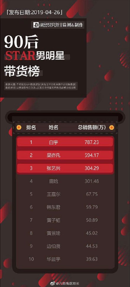 Đứng đầu trong danh sách này là nam diễn viên Bạch Vũ với tổng kim ngạch tiêu thụ là 787.23 vạn NDT. Bạch Vũ nam diễn viên sinh năm 1990 bước chân vào ngành giải trí từ năm 2014 với tác phẩm webdram đầu tiên mang tên Nhật kỷ điều ty. Kể từ đó, Bạch Vũ đảm nhận vai diễn qua nhiều tác phẩm khác nhau như Yêu em từ cái nhìn đầu tiên, Truy tìm ký ức… Và tên tuổi của anh mới thực sự được mọi người biết đến nhiều nhờ vào tác phẩm Trấn Hồn được công chiếu vào mùa hè năm 2018. Bên cạnh đó anh còn được LikeTCCAsia bình chọn là một trong những gương mặt đẹp trai nhất Châu Á với vị trí 48 trong 100 người.