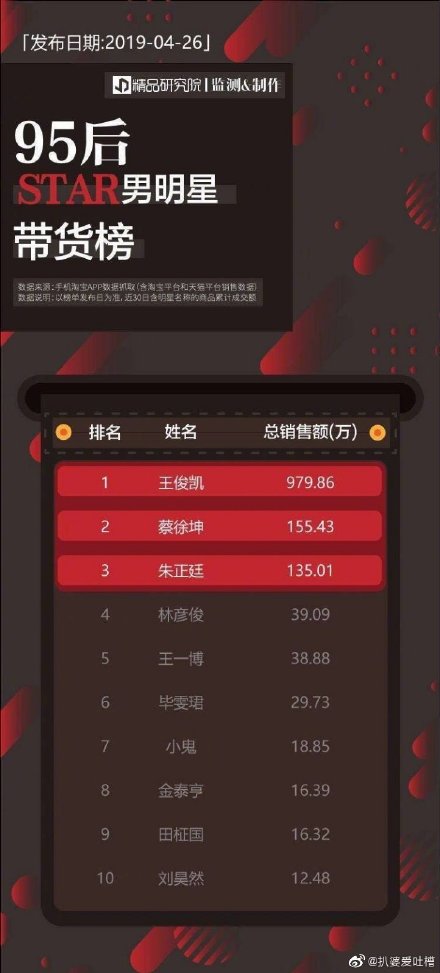 Đứng đầu danh sách này là Vương Tuấn Khải với tổng kim ngạch tiêu thụ là 979.86 vạn NDT. Vương Tuấn Khải được biết đến là nam ca sĩ, diễn viên người Trung Quốc sinh năm 1999, là một trong ba thành viên của gia tộc TF, chính thức xuất đạo, bước chân vào ngành giải trí từ năm 2013. Bên cạnh những bài hát vô cùng được yêu thích thì Vương Tuấn Khải cũng đảm nhận vai chính qua một số phim truyền hình như Điều kỳ diệu của tiệm tạp hoá Namiya, Thiên khanh ưng liệp… Vương Tuấn Khải là một trong những ca sĩ, diễn viên thế hệ trẻ vô cùng được yêu thích ở nhiều nơi trên thế giới, đại ngôn của anh cũng nhiều vô kể.