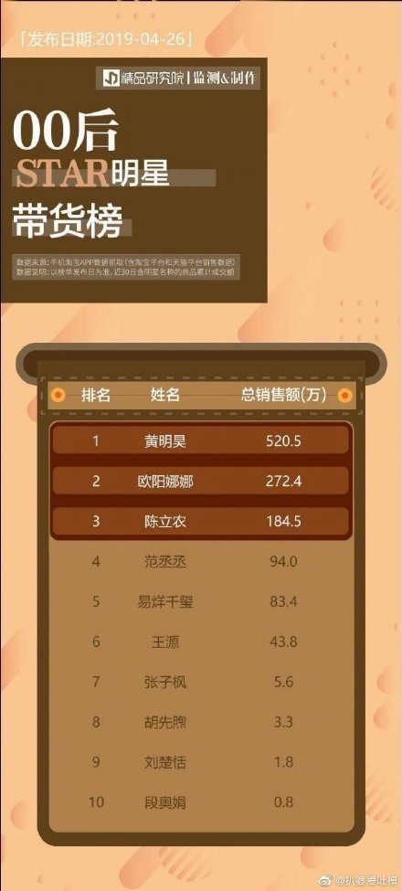 Dẫn đầu danh sách sau 00 này là nam ca sĩ người Trung Quốc - thành viên nhóm nhạc NINE PERCENT sinh năm 2002 - Justin Hoàng Minh Hạo với tổng kim ngạch tiêu thụ là 520.5 vạn NDT. Năm 2017, cậu đã gây ấn tượng lớn với khán giả khi tham gia chương trình đào tạo tuyển chọn tài năng Produce 101 mùa 2 của Hàn Quốc và chính thức bước chân vào ngành giải trí Hoa ngữ từ tháng 1 năm 2018 khi tham gia chương trình này phiên bản Trung, trở thành một trong chín thành viên của nhóm nhạc NINE PERCENT. Ngoài ra, Justin còn tham gia một số chương trình cạnh tranh khác như Quán ăn hoàn mỹ với vai trò là khách mời hay Trốn khỏi mật thất…