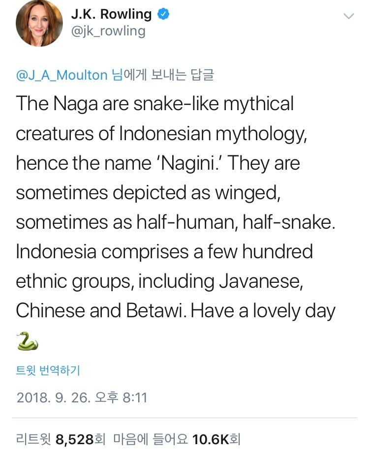 Trước tình hình này, tác giả loạt phim Harry Potter, J.K. Rowling chính thức lên tiếng giải thích rõ ràng để làm dịu đi dư luận: “Naga là những sinh vật thần thoại giống loài rắn trong thần thoại của Indonesia, do đó nó có cái tên Nagini. Đôi khi chúng được mô tả như là có cánh, đôi khi là nửa người, nửa rắn. Indonesia có vài trăm dân tộc, bao gồm người Java, người Trung Quốc và người Betawi. Chúc các bạn có một ngày tốt lành”. Cô cũng nhấn mạnh, không có vấn đề gì trong việc cast các diễn viên châu Á cả.