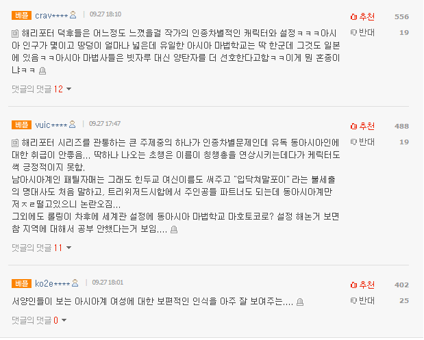 1. [+556, -19] Tôi chắc rằng hầu hết những người hâm mộ Harry Potter đã nhận ra rằng nhà văn khá phân biệt chủng tộc trong sự phát triển nhân vật của cô ấy ㅋㅋㅋ Xem xét dân số châu Á và các quốc gia lớn như thế nào, nó chỉ có một trường học phép thuật ở châu Á và nó ở Nhật Bản ㅋㅋ và rõ rằng các phù thủy châu Á dường như thích thảm hơn chổi ㅋㅋ gì vậy trời ㅋㅋ