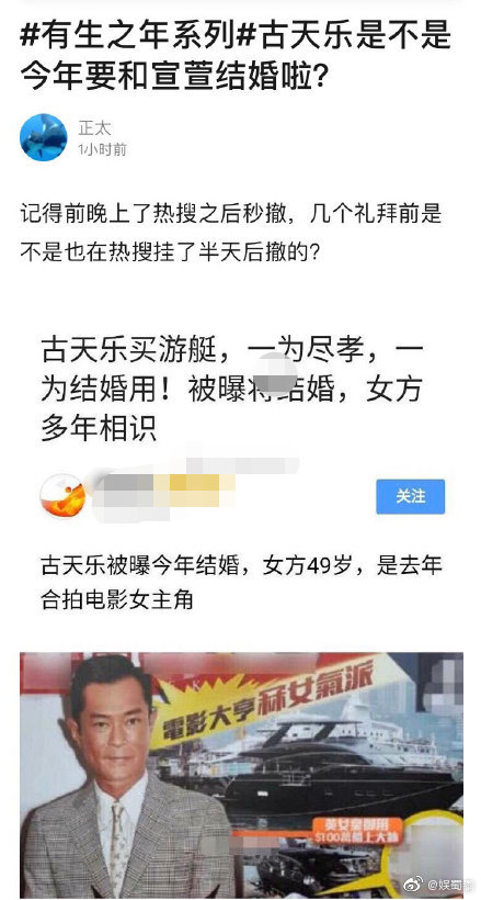 Hôm nay, trên mạng dậy sóng với tin Cổ Thiên Lạc và Tuyên Huyên sẽ kết hôn trong năm nay. Theo như tin tức lan truyền thì Cổ Thiên Lạc mua du thuyền, một là vì tận hiếu và một là dùng để kết hôn, phía nữ là bạn bè quen biết nhiều năm và năm nay 49 tuổi, nữ chính trong bộ phim điện ảnh hợp tác vào năm ngoái.