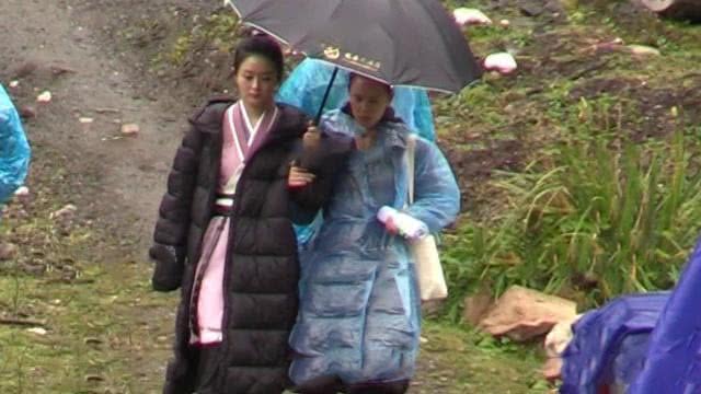 Thời tiết mưa rơi lác đác nhưng cũng đủ khiến không khí trở nên lạnh. Bên cạnh trang phục của phim, Triệu Lệ Dĩnh khoác lên mình chiếc áo lông dày để giữ nhiệt, cùng nhân viên từ nhà xe bước xuống hậu trường quay.