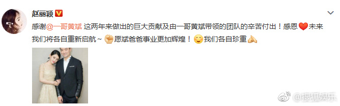 Theo truyền thông Sina đưa tin, ngày 9 tháng 10 Triệu Lệ Dĩnh đã đăng trên weibo của mình bài viết tuyên bố chấm dứt hợp tác với người quản lý hiện tại. Triệu Lệ Dĩnh viết: “Cảm ơn Hoàng Bân trong hai năm qua đã có nhiều cống hiến to lớn và những hi sinh vất vả khi nhất ca Hoàng Bân dẫn dắt đoàn đội! Cảm ân!” Tương lai mỗi người chúng ta sẽ bắt đầu một cuộc hành trình mới! Nguyện sự nghiệp của Bân ba ba càng thêm huy hoàng! Mỗi người chúng ta đều trân trọng!”