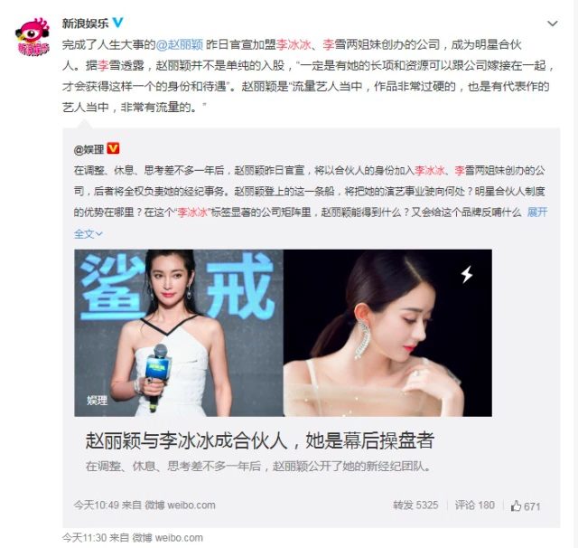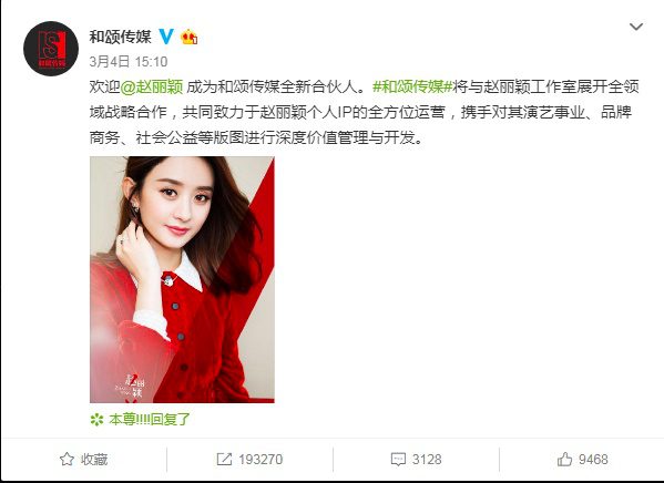 Sau khi sinh con vào tháng 3, Triệu Lệ Dĩnh tuyên bố gia nhập, trở thành đối tác của truyền thông Hòa Tụng. Từ đó về sau, Triệu Lệ Dĩnh với thân phận mới, địa vị trong giới giải trí cũng thăng cấp một bậc.