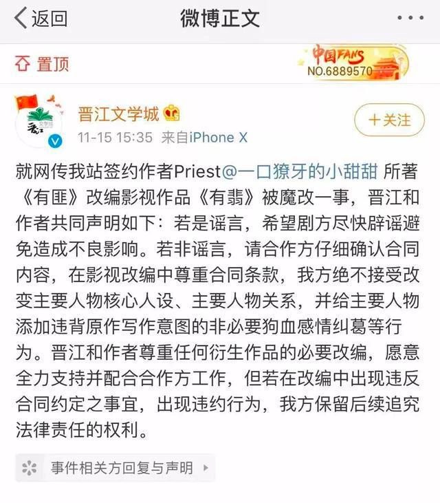 Bài đăng ủng hộ Triệu Lệ Dĩnh của Tấn Giang văn học thành.