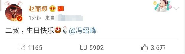 Triệu Lệ Dĩnh đăng bài viết nói “Nhị thúc, sinh nhật vui vẻ” và tag Phùng Thiệu Phong vào bài. Trước đó khi hai người họ công khai tình cảm cũng chỉ dùng hai từ “công khai” ngắn ngủi để thông báo về việc lĩnh chứng của mình. Tuy nhiên lần này Triệu Lệ Dĩnh đăng bài chúc mừng cho Phùng Thiệu Phong đã làm cho dân mạng có đôi phần hụt hẫng. Vốn họ nghĩ Triệu lệ Dĩnh sẽ đăng bài gì đó tình cảm, ngọt ngào, văn vẻ nhưng đến cuối cùng thì chỉ có 6 con chữ nhỏ bé. Tuy nhiên nhiều người nghĩ chỉ với mấy chữ này đã thấy được sự ngọt ngào rồi.
