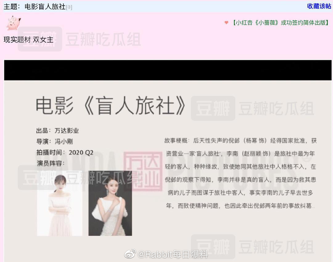 Mới đây, trên mạng xuất hiện tin Triệu Lệ Dĩnh và Dương Mịch hợp tác trong phim điện ảnh mới của đạo diễn Phùng Tiểu Cương mang tên Nhà nghỉ người mù. Đây là bộ phim điện ảnh xoay quanh hai nhân vật chính Nghê Nghiệp và Lý Nam. Phim do Vạn Đạt sản xuất dự tính sẽ khai máy vào Quý 2 năm 2020.