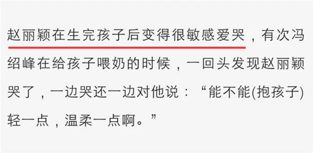 Được biết, sau khi Triệu Lệ Dĩnh hạ sinh con thì người cũng trở nên nhạy cảm hơn, thậm chí có lần Phùng Thiệu Phong đang cho con bú, quay đầu nhìn lại thì thấy Triệu Lệ Dĩnh đang khóc, vừa khóc vừa nói với anh ấy: “Có thể ôm con dịu dàng hơn chút được không“.