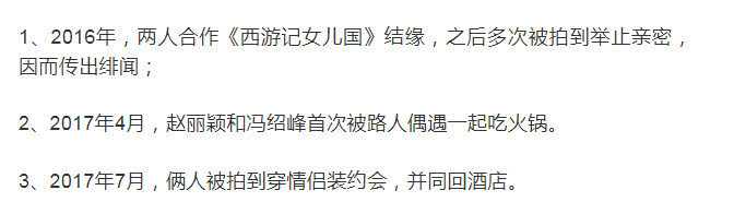 Tháng 4 năm 2017, lần đầu tiên Triệu Lệ Dĩnh - Phùng Thiệu Phong bị bắt gặp đi ăn lẩu cùng nhau.