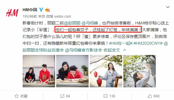 Ngày 21 tháng 1, weibo chính thức của thương hiệu thời trang đã đăng tải hình ảnh của cặp vợ chồng minh tinh nổi tiếng Triệu Lệ Dĩnh và Phùng Thiệu Phong. Lần này cả hai không những chụp chung khoe ân ái mà còn cùng nhau gói sủi cảo đón tết, vô cùng ngọt ngào. Hai vợ chồng mặc áo tình nhân, trên mặt Triệu Lệ Dĩnh luôn nở nụ cười, tâm trạng vô cùng tốt. Trong khi đó, Phùng Thiệu Phong luôn lén nhìn vợ, thể hiện rõ sự yêu chiều, hạnh phúc.
