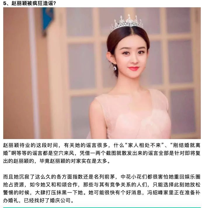 Mặt khác, có người trong giới tiết lộ khoảng thời gian ở cữ, nghỉ dưỡng sau khi sinh con, Triệu Lệ Dĩnh đã gặp phải rất nhiều tin đồn, nào là “gia đình hai bên không hòa thuận”, “vừa mới kết hôn lại ly hôn”, “không có lửa thì làm sao có khói”,… Những mẩu tin này đều nhắm vào mục đích ngăn cản, gây trở ngại cho sự tái xuất của nàng tiểu hoa. Bên cạnh đó, một thông tin khiến người hâm mộ háo hức và mong chờ nó mau chóng trở thành sự thật đó là Phùng Thiệu Phong đang gấp rút chuẩn bị cho hôn lễ bổ sung, đã tìm xong công ty tổ chức.