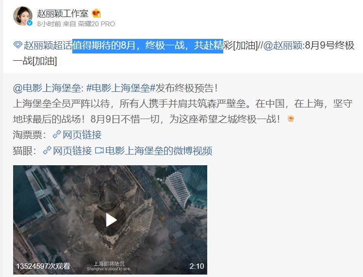 Tuy nhiên không có lửa thì làm sao có khói, chính vì động thái mới đây của phòng làm việc (studio) của Triệu Lệ Dĩnh càng khẳng định tin tức kia là có cơ sở thành sự thật. Trưa ngày 31.07, Triệu Lệ Dĩnh shares bài ủng hộ quảng bá cho phim Pháo đài Thượng Hải của Lộc Hàm và Thư Kỳ. Studio cũng nhanh chóng chuyển tiếp lời của nữ diễn viên kèm theo bài đăng: “Tháng 8 đáng để mong chờ, trận chiến cuối cùng…”