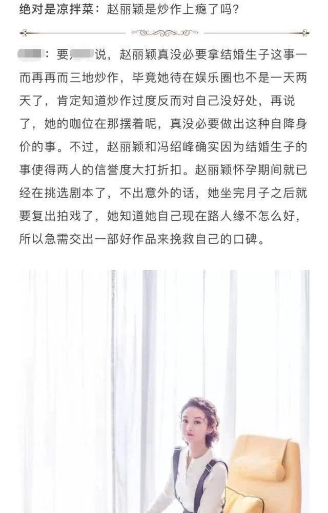 Ngày 9 tháng 3 vừa qua có một tài khoản với lượng follow lớn trên Weibo tiết lộ: “Triệu Lệ Dĩnh thật sự không cần thiết năm lần bảy lượt đem việc kết hôn sinh con ra sao tác, cô ấy ở trong ngành giải trí không phải một ngày hai ngày nên ít ra phải hiểu được những việc sao tác quá độ sẽ không mang đến kết quả tốt chứ. Hơn thế nữa, vị trí trong ngành giải trí của Triệu Lệ Dĩnh giờ đây không cần thiết phải làm ra những việc này để tự hạ thấp thân phận của mình. Thế nhưng, Triệu Lệ Dĩnh và Phùng Thiệu Phong thật sự vì chuyện kết hôn sinh con mà mang danh tiếng và sự uy tín của cả hai giảm đi không ít.