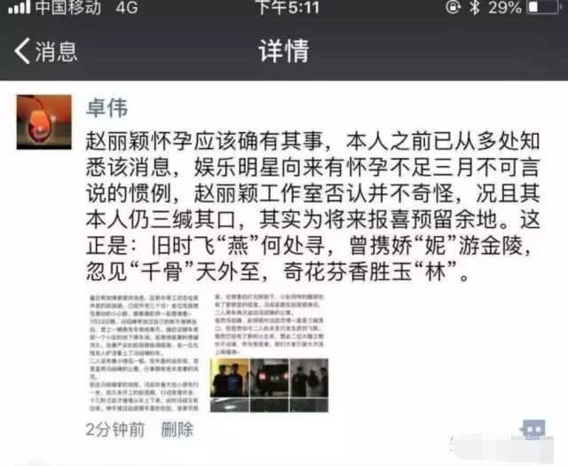 Dù phía Triệu Lệ Dĩnh phủ nhận nhưng Trác Vỹ lại đăng trong vòng bạn bè nói Triệu Lệ Dĩnh thực sự mang thai nhưng việc cô phủ nhận không có gì là lạ khi những minh tinh trong ngành giải trí trước giờ khi mang thai chưa đủ ba tháng thì không được nói ra.