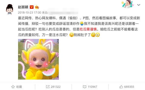 Đến tháng 10 năm 2018 Triệu Lệ Dĩnh và Phùng Thiệu Phong - hai nạn nhân cho những tin đồn trong suốt một năm dài vừa qua đột nhiên tuyên bố lĩnh chứng kết hôn. Mặc dù cả hai chọn lúc 10:07 ngày 16 tháng 10 tuyên bố vì ngày đó cũng trùng với ngày sinh của Triệu Lệ Dĩnh nhưng không ít cư dân mạng cho rằng có thể vì việc mang thai nên cả hai mới bị ép đến thời điểm này tuyên bố. Sau đó, Triệu Lệ Dĩnh thường được bắt gặp và đều bị nghi ngờ có em bé, đối với những tin đồn này Triệu Lệ Dĩnh trực tiếp đăng weibo nói: “Ăn dưa cần phải cẩn thận, trước khi chúng ta ăn nên xem thử đó có chất lượng của quả dưa như thế nào, coi chừng đau bụng” ám chỉ quần chúng ăn dưa.