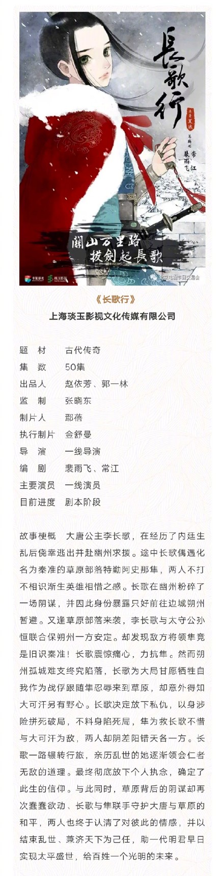 Trường ca hành (长歌行) là bộ phim truyền hình được chuyển thể từ tiểu thuyết cùng tên của nhà văn Hạ Đạt xoay quanh câu chuyện đề tài lịch sử nhà Đường và quá trình trưởng thành của công chúa hoạt bát đáng yêu Vĩnh Ninh công chúa - Lý Trường Ca. Thái tử Lý Kiến Thành - phụ thân Lý Trường An, cùng với huynh đệ và mẫu thân bị thúc phụ - Hoàng đế thứ hai đời Đường Lý Thế Dân sát hại. Sau khi biết tin phụ thân bị sát hại, Lý Trường Ca đã trốn khỏi cung, viết nên câu chuyện của riêng mình.