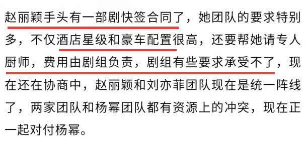 Ekip sản xuất bày tỏ họ không có đủ khả năng để lo những điều này, hai bên vẫn đang tiếp tục thương lượng để đi đến hợp đồng thỏa đáng. Ngoài ra, nguồn tin này còn bày tỏ, Triệu Lệ Dĩnh cùng đoàn đội Lưu Diệc Phi đã bắt đầu hợp tác, “họng súng” nhất trí chĩa về Dương Mịch. Bởi vì tài nguyên của Triệu Lệ Dĩnh cùng Lưu Diệc Phi đối với tài nguyên Dương Mịch có xung đột, cho nên bọn họ cùng nhau bắt tay đối phó Dương Mịch.
