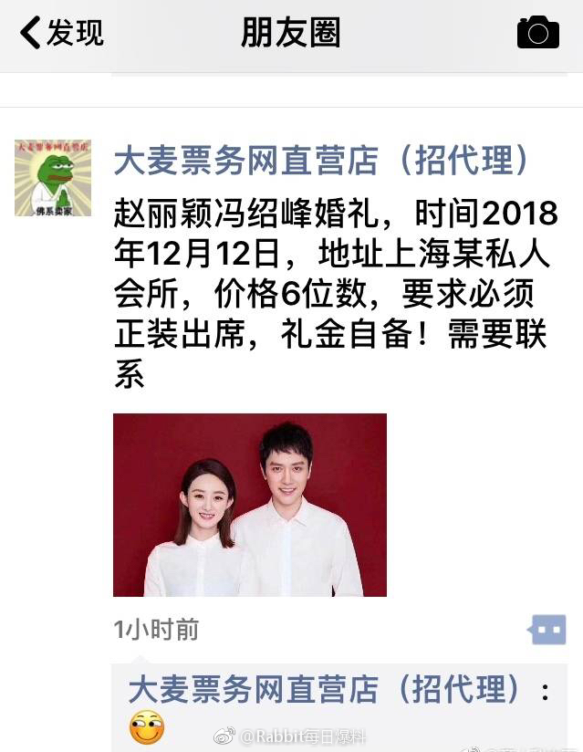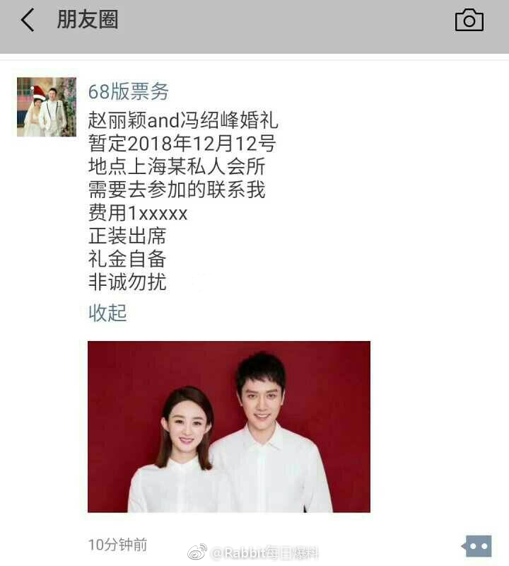Một ngày trọn vẹn niềm vui với người hâm mộ khi mới đây tiếp tục xuất hiện tin đồn: Phùng Thiệu Phong và Triệu Lệ Dĩnh cả hai sẽ cử hành hôn lễ tại một tư nhân hội nào đó ở Thượng Hải (tư nhân hội là nơi dành cho những người có tiền) vào ngày 12 tháng 12 năm 2018.