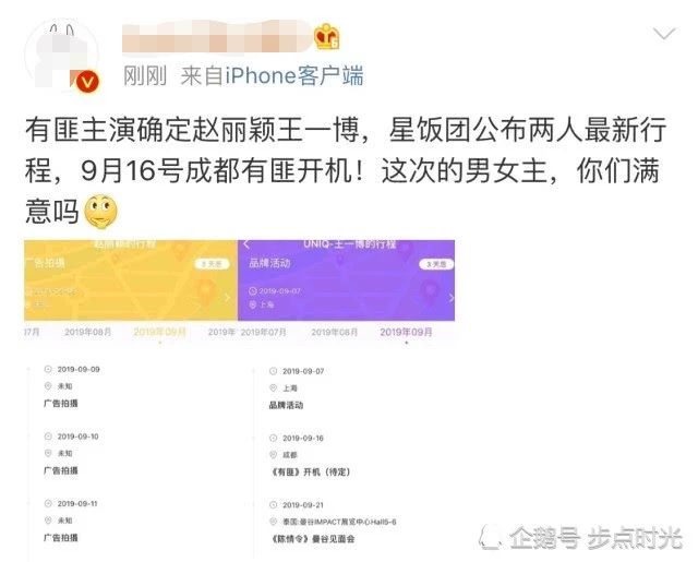Hôm nay (04.09), trên mạng lan truyền thông tin được cho là lịch trình sắp tới của Triệu Lệ Dĩnh và Vương Nhất Bác. Trong đó ghi rõ cả hai sẽ cùng gia nhập đoàn phim Hữu phỉ, bộ phim sẽ khai máy vào ngày 16.09 tại Thành Đô. Trước đó, rất nhiều nguồn tin úp mở cho rằng Vương Nhất Bác và Triệu Lệ Dĩnh là nam - nữ chính của Hữu phỉ, nhưng đến bây giờ vẫn chưa có bên nào lên tiếng xác nhận.