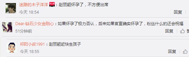 Người hâm mộ Trung Quốc đã có những phản hồi tích cực, bên cạnh đó một bộ phận không nhỏ cư dân mạng nghi ngờ rằng: “Triệu Lệ Dĩnh đang mang thai nên không tiện đến tham dự”, “Phủ nhận việc mang thai, sau đó nếu thông báo thực sự có em bé, người hâm mộ sẽ chúc mừng cho chị”, “Triệu Lệ Dĩnh nhanh có con thế”,..cùng nhiều bình luận khác.