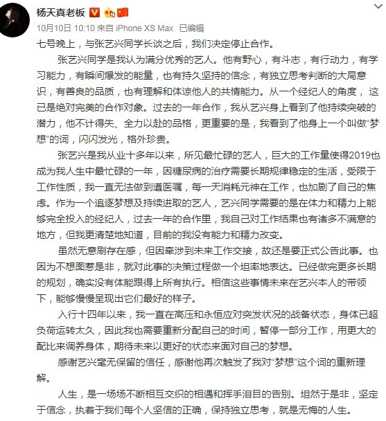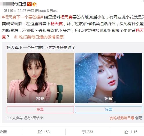 Sáng qua, Dương Thiên Chân đăng lên weibo chính thức tuyên bố vì nguyên nhân sức khỏe sẽ không hợp tác với Trương Nghệ Hưng nữa. Ngay sau đó, trên mạng đã lan truyền tin đồn cho rằng Dương Thiên Chân sẽ ký kết với nữ minh tinh nhân khí sau 90, cư dân mạng chỉ ra có thể là Trịnh Sảng và Dương Tử. Thậm chí, bloggers còn phát động dân mạng bỏ phiếu bình chọn ai sẽ là người hợp tác với Dương Thiên Chân.