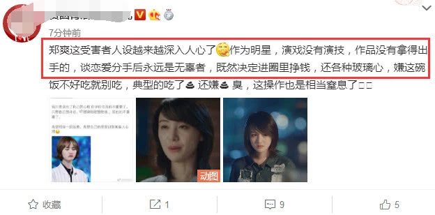 Thế nhưng cũng có tài khoản lên tiếng chỉ trích Trịnh Sảng nói rằng vốn là minh tinh nhưng khả năng diễn xuất thì không có, tác phẩm cũng không có gì đặc sắc. Sau khi yêu đương chia tay thì mãi mãi là kẻ vô tội! Nếu như đã quyết định vào ngành giải trí kiếm tiền thì đừng có trái tim “thủy tinh” (mềm yếu) như vậy. Kiếm miếng ăn không dễ thì đừng ăn, thao tác này cũng tương đối ngột ngạt quá rồi.