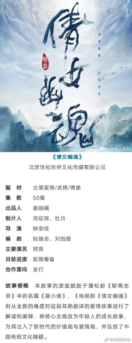Thiện nữ u hồn là bộ phim truyền hình cải biên từ tác phẩm Liêu trai chí dị của Bồ Tùng Linh với nhân vật Nhiếp Tiểu Tình, bắt đầu với một góc độ hoàn toàn mới để hóa giải câu chuyện. Mới đây, trên weibo xuất hiện tin Thiện nữ u hồn đang trong quá trình chuẩn bị sẽ được khởi quay trong thời gian sắp tới.