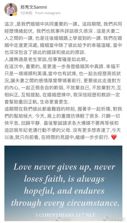 “Lần này như một khóa học quan trọng trong hôn nhân của chúng tôi. Khoảng thời gian này chúng tôi cùng nhau trải qua những thăng trầm của cảm xúc, chúng tôi cũng vì chuyện này mà nói chuyện với nhau rất lâu và cũng rất sâu. Đây là khóa học giữa hai vợ chồng chúng tôi cũng là khóa học mà chúng tôi học được trong hôn nhân về sau. Hôn nhân chúng tôi đã đi đến vô cùng sâu đậm, trong hôn nhân ngoại trừ những lúc hạnh phúc, dịu dàng nồng ấm ra thì cũng bao hàm cả sai lầm lẫn tha thứ cho nhau.