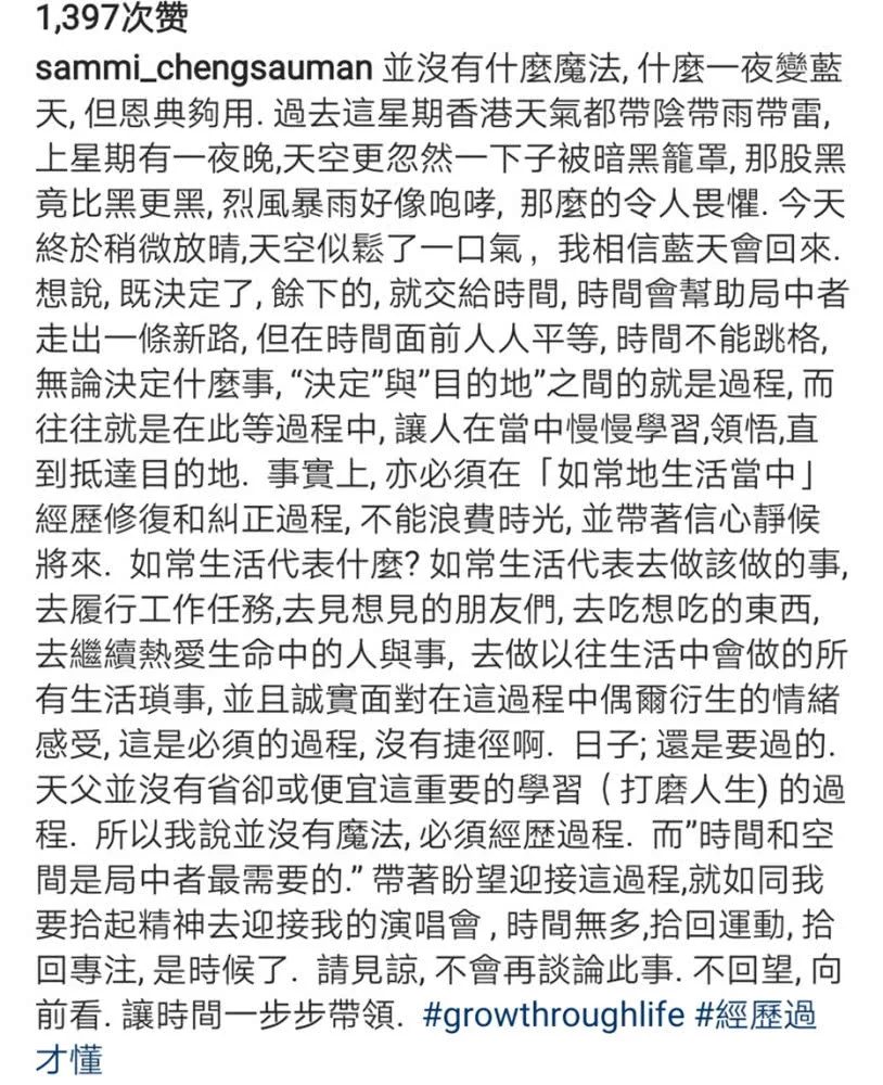 Bài viết mà Trịnh Tú Văn đăng cũng là một bài viết dài khác trả lời liên quan đến chuyện Hứa Chí An ngoại tình, cô cho biết những ngày ngày thời tiết âm u có mưa có sấm chớp nhưng bắt đầu từ hôm nay sẽ dần dần tươi sáng, đồng thời cô khuyên bản thân “Nên làm những chuyện nên làm, hoàn thành tốt nhiệm vụ công việc, đi gặp bạn bè mình muốn gặp“.