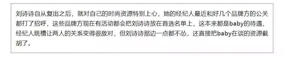 Nguyên nhân xuất phát từ người quản lý hiện tại của Lưu Thi Thi. Theo như những gì được đăng tải thì kể từ khi Lưu Thi Thi tái xuất, tài nguyên thời thượng của cô đang ngày càng tốt. Người quản lý mới của Lưu Thi Thi không những trực tiếp đánh tiếng, trao đổi với các sản phẩm nổi tiếng khác còn cuỗm đi mất tài nguyên của Angelababay.